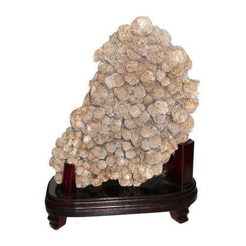 沙漠玫瑰因開采困難,產(chǎn)量稀少,形狀奇特,所以,在天然奇石市場上占有特殊地位,具有極其珍貴的研究和收藏價值。它有一瓣瓣玫瑰石瓣,逼真地開放著。是細沙在幾千萬年甚至幾萬萬年的風雨雕塑中風化而形成的。其中還有零星的細沙鑲嵌在花瓣的中間。它沒有玫瑰花的葉和刺,只有花朵默默地開放在戈壁灘中,但它永遠不會枯萎,也不會凋零。