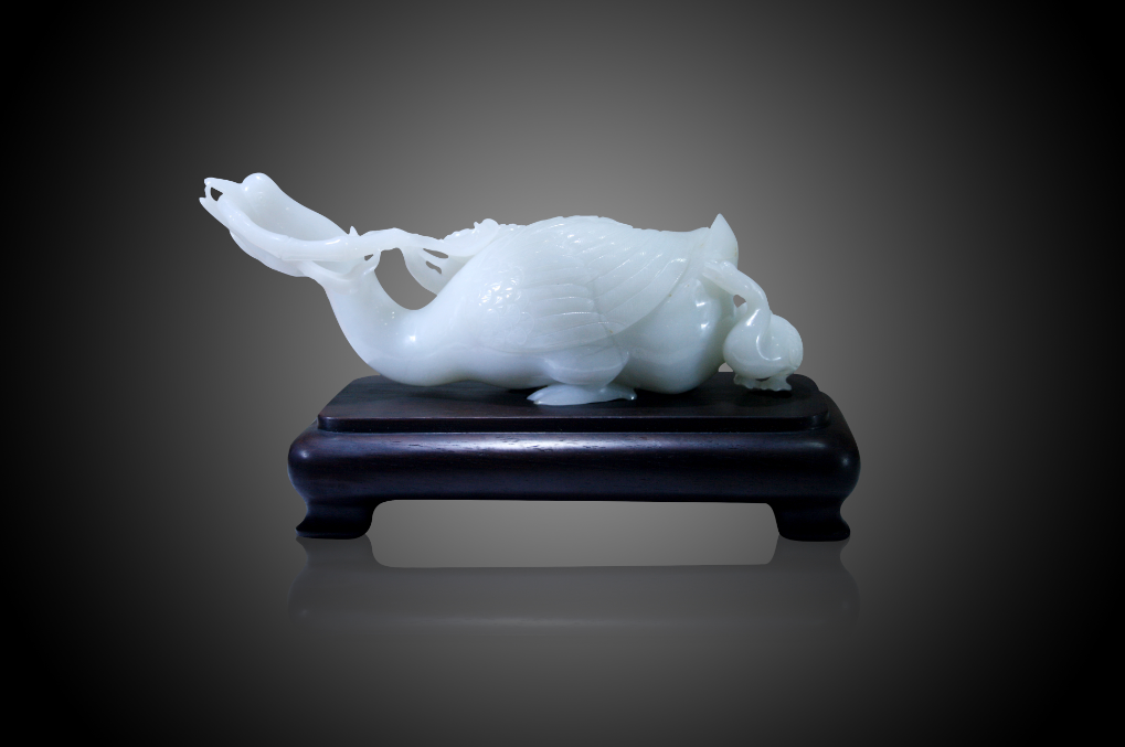 不鳴則已,一鳴驚人,故此而得名為《名甲天下》。作品通體雪白無暇、晶瑩飽滿、細(xì)膩?zhàn)虧?rùn),玉質(zhì)溫潤(rùn),色度均勻,鵝頭造型簡(jiǎn)潔大氣,鵝身厚重沉穩(wěn),呈挺胸伏臥狀,神韻兼?zhèn)洌瑯O具感染力。整體紋飾簡(jiǎn)潔形象,雕工質(zhì)樸而不失精美。為饋贈(zèng)收藏、賞玩怡情的佳品。
