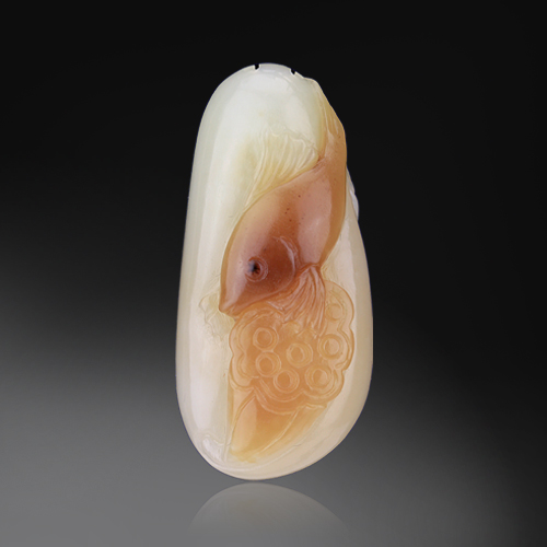 作品構(gòu)思巧妙,鯉魚躍然而起于荷花之間,喜慶之意呼之欲出。“魚”與“余”諧音,自古是深受人們喜愛的喜慶造型,象征吉慶有余、連年有余。且玉質(zhì)上佳,工亦良工,遠觀近看寶氣盈盈。盤之玩之,難以釋手。